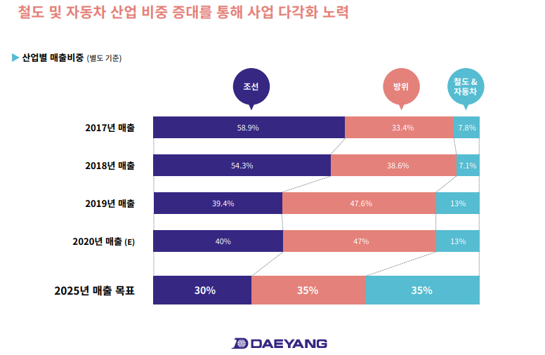 지금은 선박용 조명과 방위에 90% 가까운 비중을 차지하고 있는데 19년부터 철도&자동차 사업의 비중을 점점 늘리는 추세이며 25년의 경우 약 30%까지 늘리는 것을 목표로 하고 있다