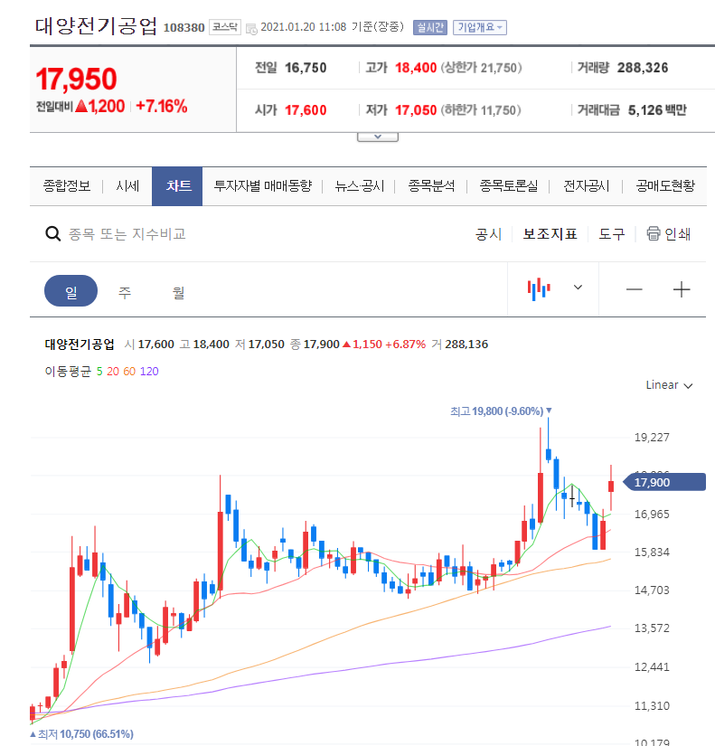 차분하게 우상향을 향하고 있는 점은 좋으나 주식을 한 달 이상 보유하면서 지켜보니 5% 오르면 4% 반납하고 그리고 횡보, 7% 오르면 다음 날 5% 반납.. 이런 식의 흐름이 이어지고 있다. 이 종목이 쭉 치고 나가려면 현대차의 수혜를 받아야만 할 것 같다.
