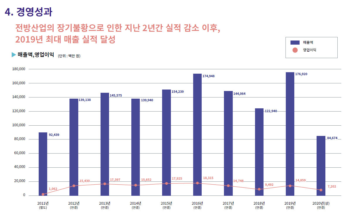 매출액은 16년에 정점을 찍고 17~18년 감소하였지만 19년에 다시 회복하였다. 하지만 코로나 영향과 중공업 회사들의 선박 수주가 부진했던 탓인지 20년 매출액은 좋지 않은 상태이다. 그럼에도 회사가 신사업에서 매출을 확대해나가려는 노력은 긍정적이다.