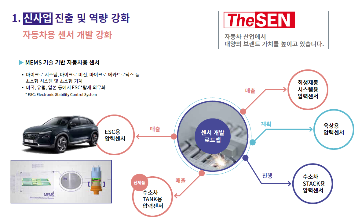 수소차 tank용 압력센서는 현대차의 넥쏘에 납품 중이라고 하고 MEMS 기반 ESC용 압력센서 경우 국산화에 성공하여 만도에 납품 중이라고 한다. 그리고 현기차에 ESC는 지금 99% 수입산을 쓴다고 하는데 대양전기공업 제품으로 전량 대체된다면 엄청난 호재로 작용할 것 같다.