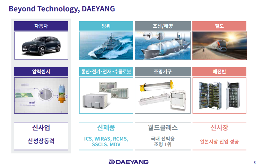 주요 사업으로는 조선용 조명사업 45%, 방산사업 40%, 철도 10%, 기타(차량용 센서 및 기타 5%)로 구성